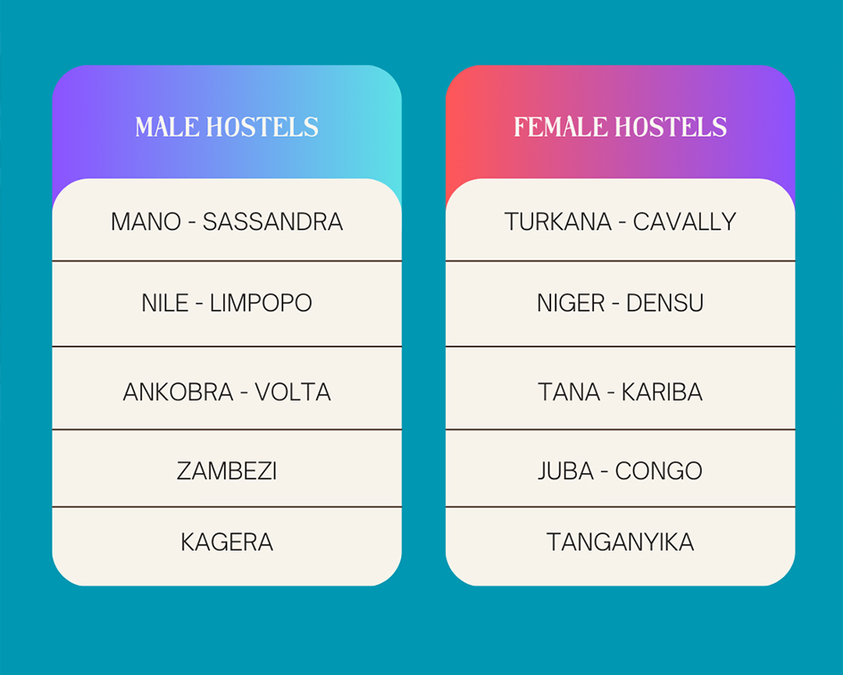 The hostel facility features 17 hostel units – 8 male and 9 female. Hostels exist in twin clusters each overseen by a Hostel Tutor and led at the student level by a Hostel Prefect. Monitors, when appointed, provide an additional layer of support. The hostels are identified by the names of rivers across the African continent. This is just another way of consolidating our pan-African identity.