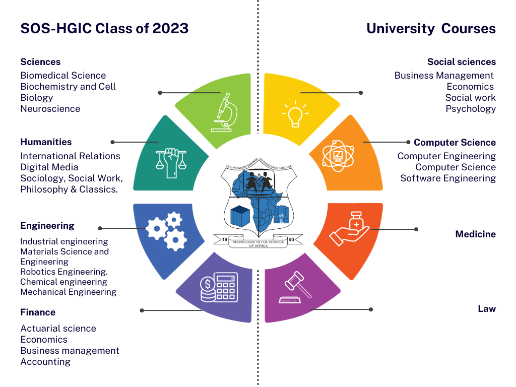 At SOS-HGIC, our vision is to empower and inspire our students to achieve excellence, not only during their time with us but throughout their entire educational journey. Our ultimate goal is to see our graduates embark on the path to leading universities around the world, armed with the knowledge, skills, and character to make a significant impact on society. We believe that every student has the potential to reach great heights, and we are committed to guiding them on this transformative journey. The pie chart below illustrates the academic preferences of our SOS – HGIC students from the class of 2023 as they embarked on their college journeys. The chart reveals a diverse array of disciplines chosen by these students, reflecting their academic interests and aspirations.