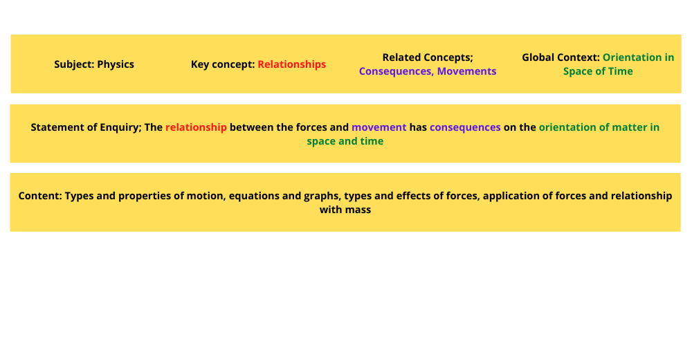 Rather than taking the form of a series of curriculum statements assessed through formal examinations, the MYP is organized around concepts that are important in various academic subjects and can also act as links between them. These provide the basis for subject-based learning and also for curriculum integration. Concepts are connected to global contexts that promote the international-mindedness at the heart of the International Baccalaureate in order to form statements of inquiry from which the content and skills of the curriculum will flow. Students will experience a sequence of units in each course – each of which is organized in this way.